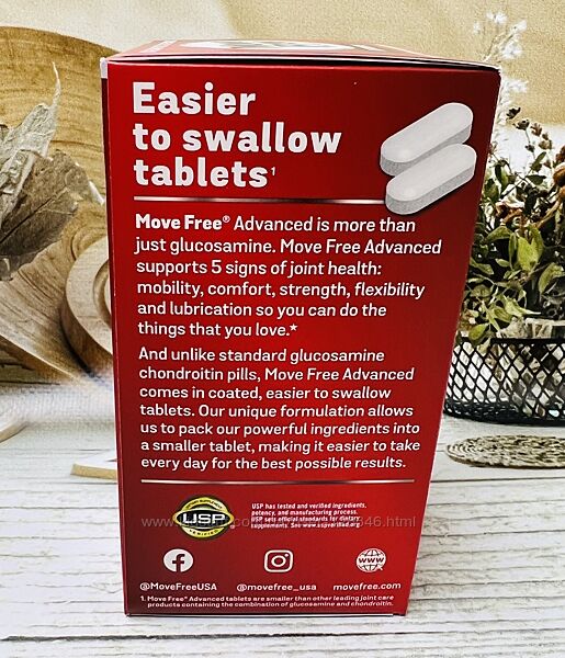 Move Free Advanced підтримує 5 ознак здоров´я суглобів: мобільність, гнучкість, міцність, мастило та комфорт, тому ви можете робити те, що вам подобається. Він робить це, надаючи вам високоякісні складові здоров´я: глюкозамін, хондроїтин, уніфлекс та гіалуронову кислоту (HA).