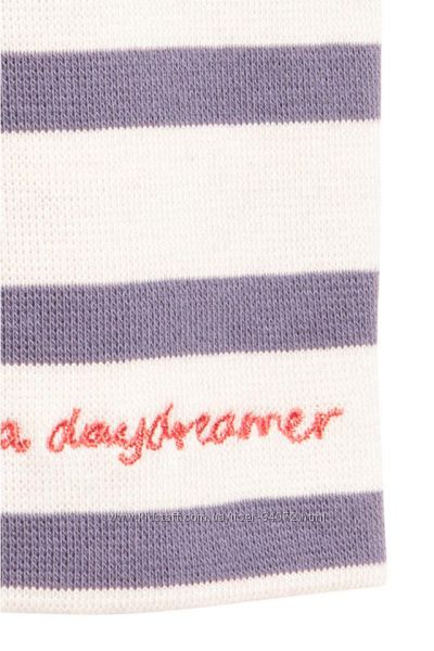 Двухслойная шапка из хлопкового трикотажа в полоску с маленькой вышивкой по нижнему краю.