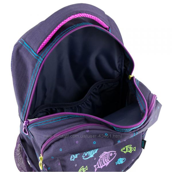 Рюкзак состоит из 2 отделений, переднего, внутреннего и 2 боковых карманов, для бутылки с водой. Передний карман содержит удобный органайзер для канцелярии и личных вещей. Контрастная подкладка помогает быстро отыскать нужные вещи.
