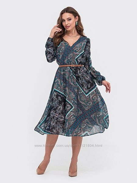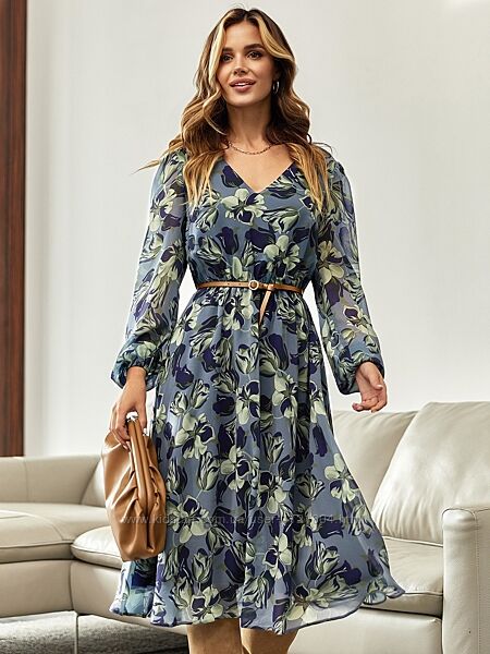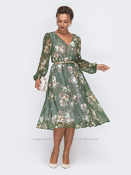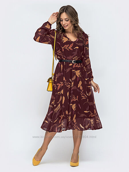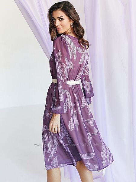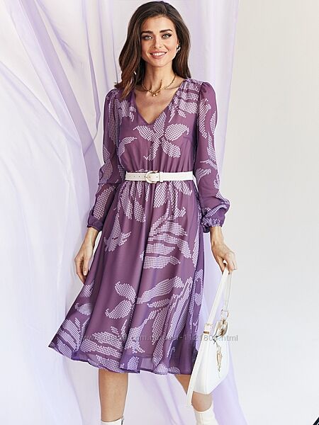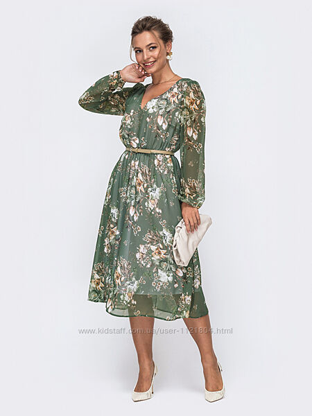Шифоновое платье с V-образным вырезом горловины. Модель отрезная по линии талии с эластичной деталью в поясе. Длинный рукав присобран на резинку по низу. Подкладка выполнена из хлопка. Пояс в комплект не входит.