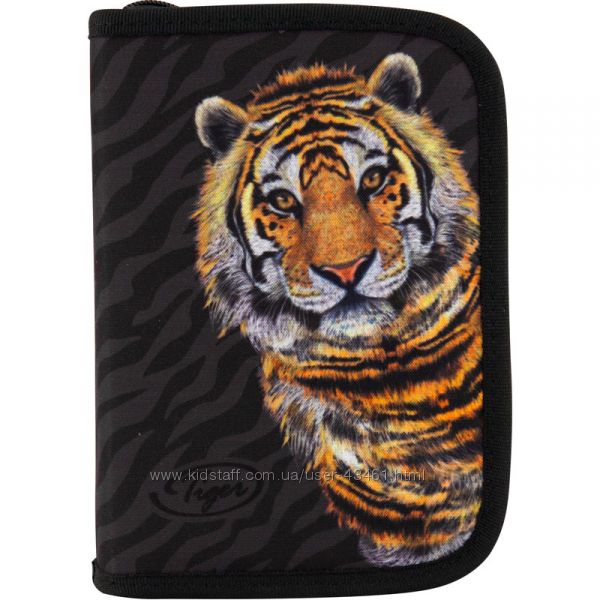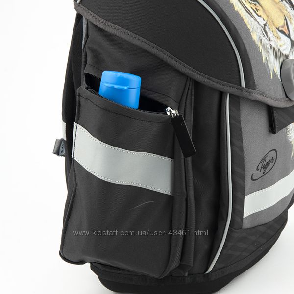 Рюкзак Kite K18-578S-2 для мальчиков младшей и средней школы выполнен из прочного полиэстера серого и черного цветов с изображением тигра.