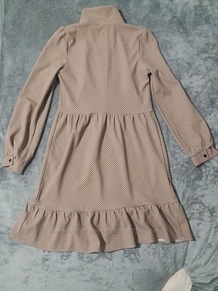 Продам платье, красивый крой. Не мнется, на размер С/М. Фасон свободный. ПОГ-42 см, хорошо тянется, ПОТ-40 см, ПОБ -53см, рукав 62см, по внутр.части - 45см, плечи-35см, длина -92см, Цена 250 гривен. Красивый темно-бежевый цвет в мелкий сине-черный горошек. Возврат не предусмотрен. - продано!Продам отличное платье красивый крой. Имитация запаха, пояс в комплекте из такой же ткани длинный, широкий. На наш 44/46, можно и 46. Указан 12 размер. Ткань эластичная на подкладке.