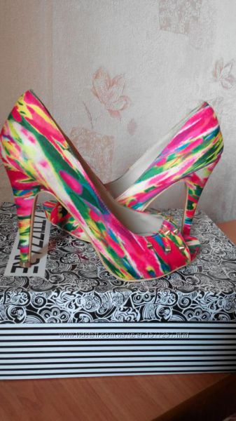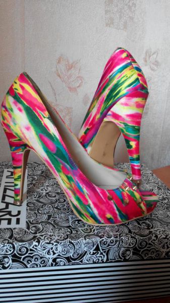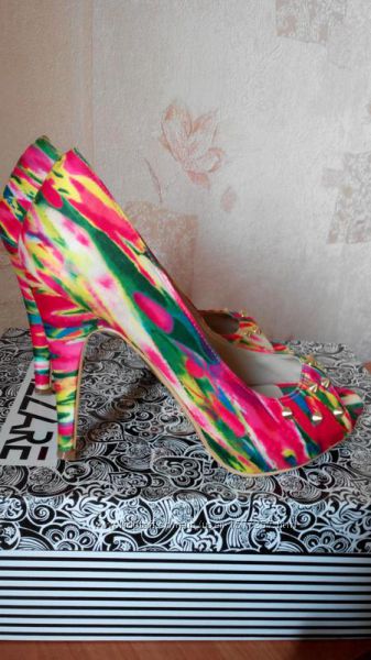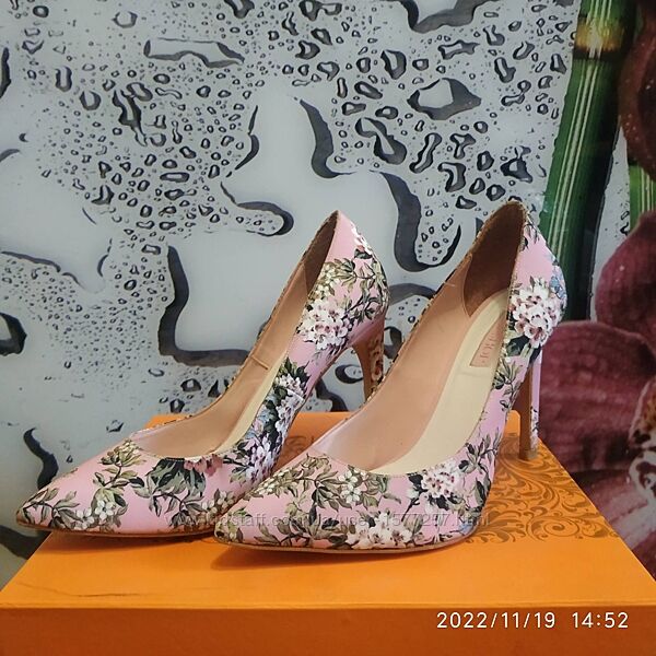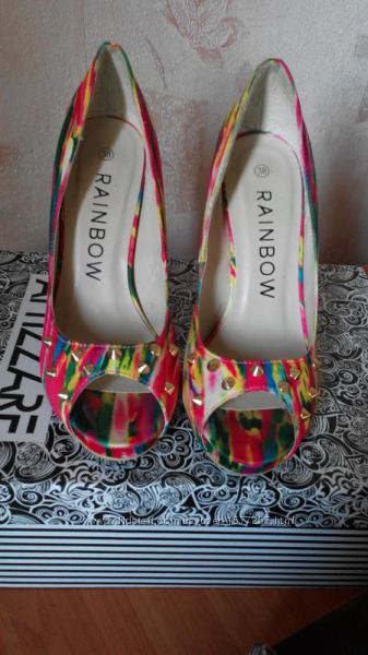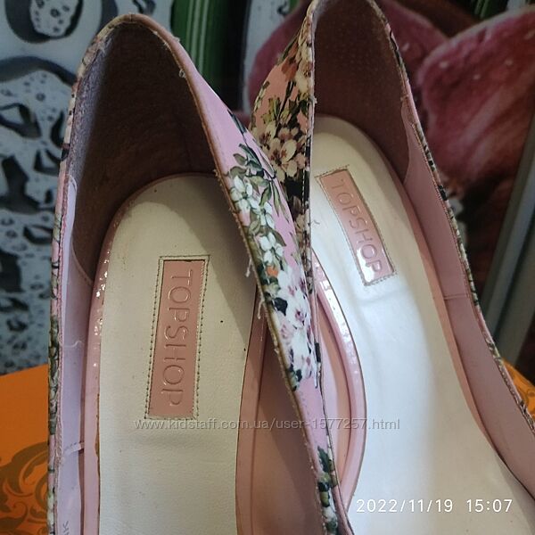 Брендові красиві, неіжно-рожеві туфельки - човники Top Shop в квітковий принт 38 розмір, на стопу 24,5-25 см. Взуті 1 раз. Без дефектів. Ціна 680 грн.Яскраві райдужні туфельки на невеликій платформі, з французьким пальчиком і декоровані золотистими заклепками зпереду. Підійдуть під любу кольорову гаму одежі і аксесуарів. Розмір 38, на стопу 24,5 см. Без дефектів, стан відмінний. Ціна 675 грн.
