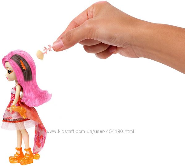 Познакомься с Кларитой и ее другом, рыбкой-клоуном Кеклом. Героиня серии Enchantimals «Морские подружки» одета в яркий оранжевый костюм со шлейфом, похожим на рыбий хвост, а на руках и голове у нее есть плавники, точно такие же, как и у ее маленького питомца. Но главное волшебство куколки - в ее роскошных волосах, которые способны менять цвет в зависимости от температуры воды. Проведи по ним коралловым гребнем, окунув его в холодную воду из специального аквариума, и ты увидишь магическое превращение: локоны из каштановых станут розовыми!