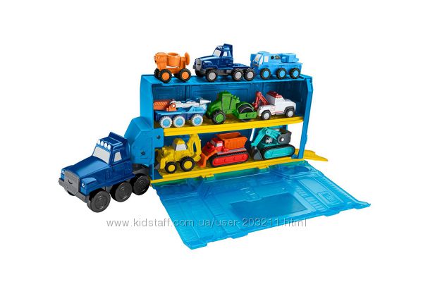 Двухтонный грузовик-перевозчик из мультфильма Боб Строитель. Продается без машинок героев на фотографиях! Три уровня хранения, вмещается до 9 машинок. Встроенная рампа для легкой погрузки и разгрузки машин. Кабина снимается.