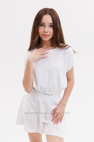 Літній костюм білого кольору для дівчинки. Костюм складається з топу та спідниці-шорт. Тканина костюмна "Стейсі". Швидкий чат в Viber +380981524613