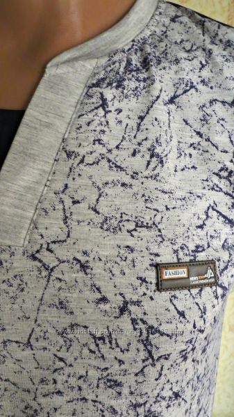 Футболка подростковая мраморного рисунка в разных цветах - светло-серый, темно-синий, голубой, морская волна. Фасон выреза горловины - V-образный украшенный пуговицами. На груди эмблема с кожзам.