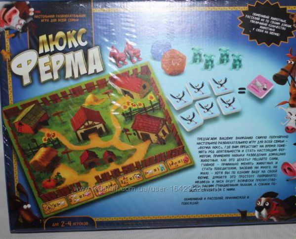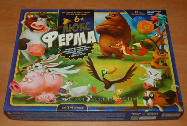 Настольная игра "Ферма Люкс"Предлагаем вашему вниманию самую популярную настольную развлекательную игру для всей семьи — «Ферма Люкс», где вам предстоит на время поменять род деятельности и стать настоящим фермером, применяя навыки разведения домашних животных. Как это делать? Решайте сами, главное — правильно менять животных и стать победителем, заселив ни много, ни мало — хотя бы по одному виду на своей ферме. Думаете это просто?? попробуйте! Медведь и Лиса будут всячески препятствовать вашим грандиозным планам, а собаки помогут справиться с ними. Обменивай и расселяй, приумножай и побеждай!
