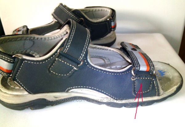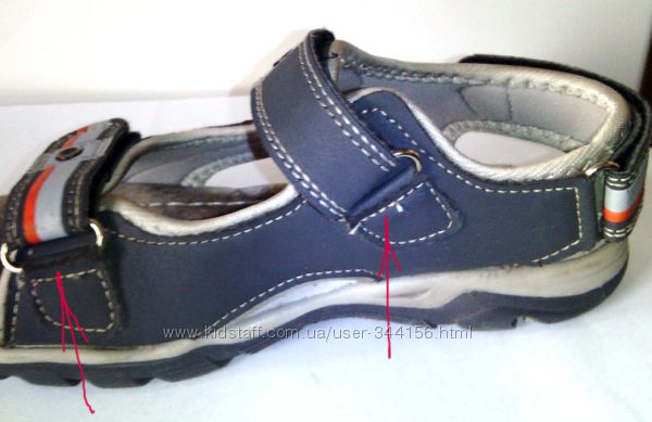Босоніжки на липучках, б/в в гарному стані. Довжина устілки 20,5 йдуть на ногу 19,6 - 21 см. Матеріал штучний. Нюанс - трохи протерлось верхнє покриття в місцях, вказаних стрілками. Все інше норм, підошва ціла, міцна.