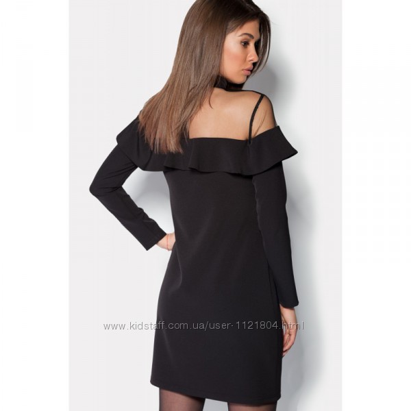 Модное черное платье с соблазнительной кокеткой из мелкой сеточки. Платье шьется с прозрачной кокеткой, от которой нашивается один ряд широких рюшей. У наряда длинные рукава и потайная молния.
