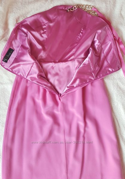 Открытая спинка, сзади на замочке. Дополнительные силиконовые вставки по спинке для лучшей фиксации на фигуре. На шейке завязывается на ленту с цепочкой. Платье на подкладе, юбка двухслойная из шелка.