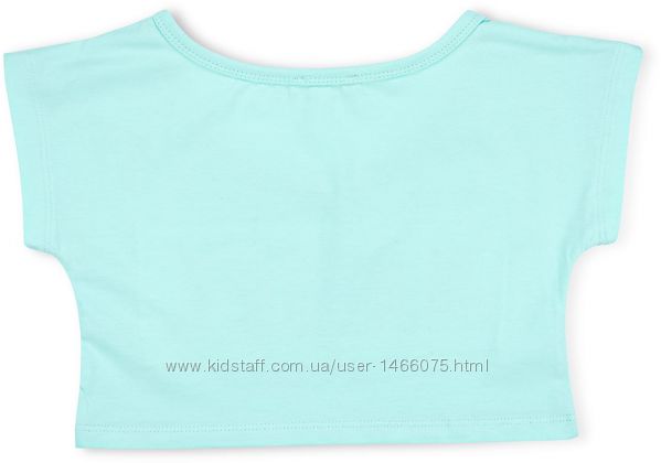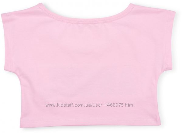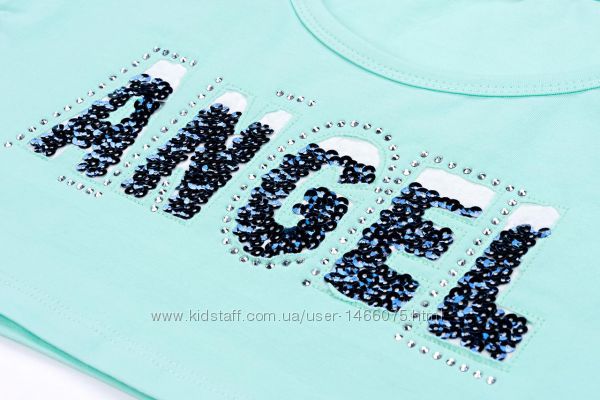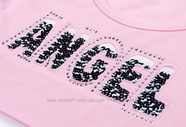 Топ – укороченная широкая футболка из тонкого трикотажа, с цельнокроеным коротким рукавом и немного углублённым вырезом горловины. Спереди украшен стильной аппликацией «ANGEL» с пайетками и стразами.