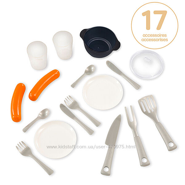 - 17 аксесуарів: 2 келихи, 2 тарілки, столові та кухонні прилади, каструльку та 2 ковбаски;