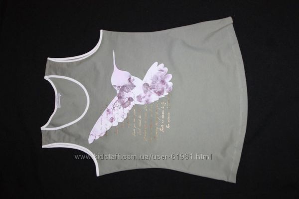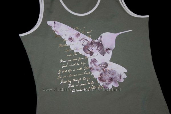 Топ футболка ANISTON - ШИКАРНЕЙШЕЕ качество!! Эта оригинальная майка топ с калибри станет любимой летней вещью!Модная майка хаки с интересным принтом (колибри с цветами и надпись золотыми буковками.