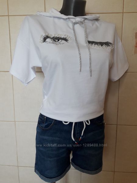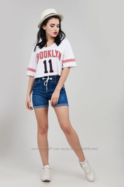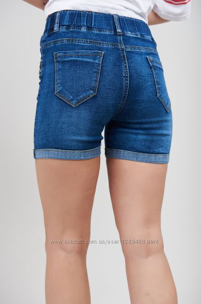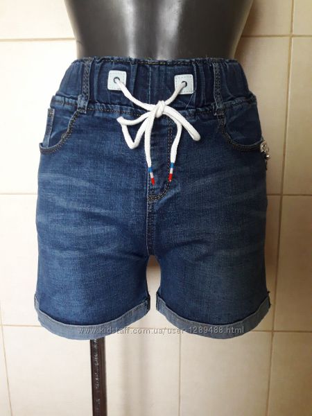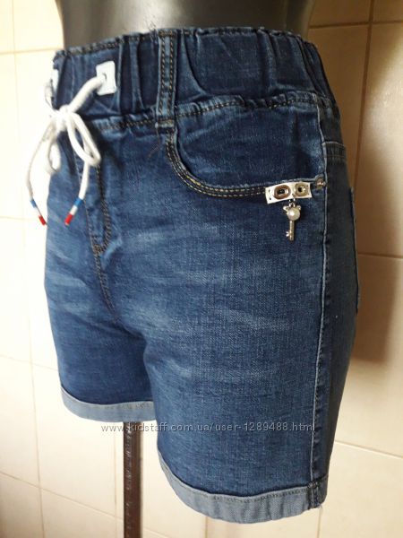 Красивые,качественные,стрейчевые джинсовые шорты Мом,с высокой посадкой. Модель облегающего кроя. Шорты с эластичной резинкой на поясе, что обеспечит оптимальную посадку. Пояс дополнен кулиской-шнурком. На передней части изделия расположены два удобных врезных кармана, сзади - два накладных кармана.Шорты декорированы маленьким украшением,ключиком с жемчужиной.длина-34см.шага-9см