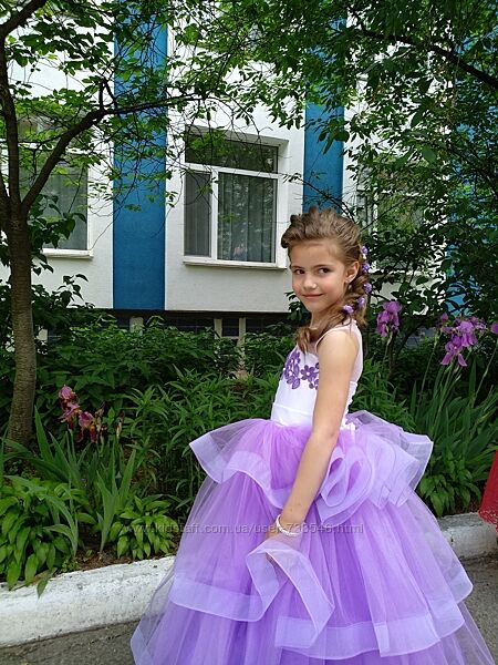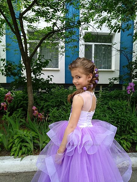 Невероятно красивое платье! Цвет нежная фиалка. В идеальном состоянии. При росте 118 почти до пола Сзади молния и шнуровка.В комплекте подъюбник самодельный.