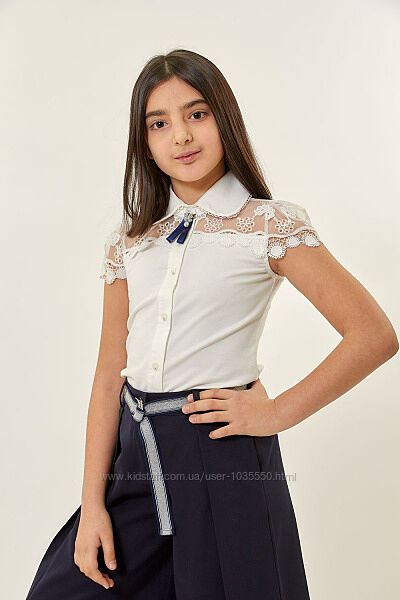 НОВИНКА НА ШКОЛУ!!!Блузка на девочку от бренда Delores.Цвет белый.Размеры 134-164р.Рукав короткий ввиде воланов.Воротник круглый,отложной.Под ним прикреплена брошь синего цвета.Застежка сзади на пуговице.