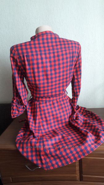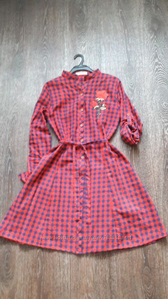 Красивое платье в красно-синюю клетку в идеальном состоянии (одела 2 раза) с декором вышивкой роза. Тоненькая х/б ткань (100% котон). Очень легкое и приятное к телу. На пуговицах, на поясе, воротник стойкаРазмер указан 38 М, идет на С