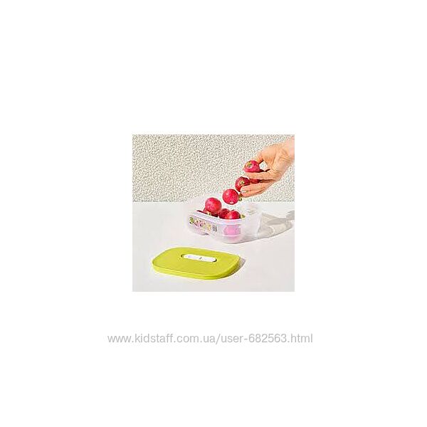 Новый контейнер из серии «Умный холодильник» состоит из прозрачного основания, объемом 800 мл , решетки, и крышки 3-го класса со слайдером оснащенным системой вентиляции воздуха.