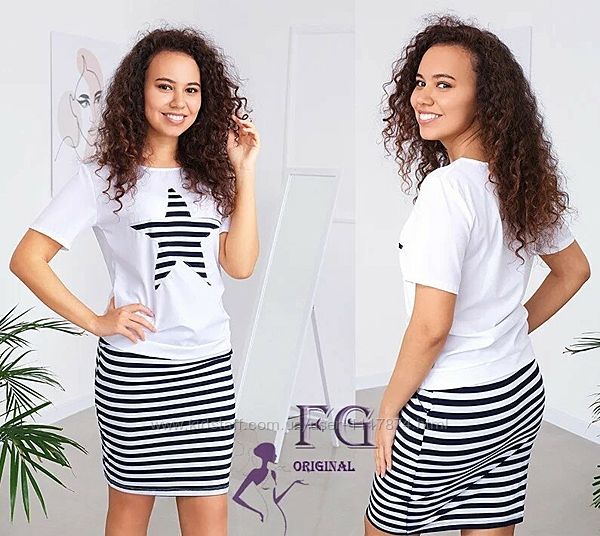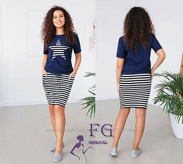 Модель состоит из футболки и юбки. Футболочка с круглым вырезом горловины и короткими рукавами. В области груди нашита крупная звезда, которая привлекает внимание и добавляет образу индивидуальности. Верх комплекта изготовлен из плотного, но очень легкого софта. Юбка приталенного кроя, пояс на резинке и шнурке. Спереди есть два удобных кармана. Для пошива юбки использована турецкая вискоза. Она мягко облегает женские формы, не сковывает движений и позволяет коже дышать, даже в самую жаркую погоду.