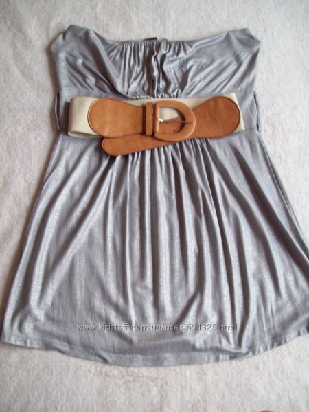 Пропоную легку сріблясту туніку від E-vie. Бюстьє, верх на гумці, бретелей немає. Матеріал – віскозний трикотаж. Нова, стан відмінний, дивіться фото. Гарно виглядає з широким ременем-гумкою. Можна для вагітних.Розмір вказаний 10-12, довжина 60 см, ширина верху 37 см, тягнеться до 47 см, під грудьми 35-43 см.
