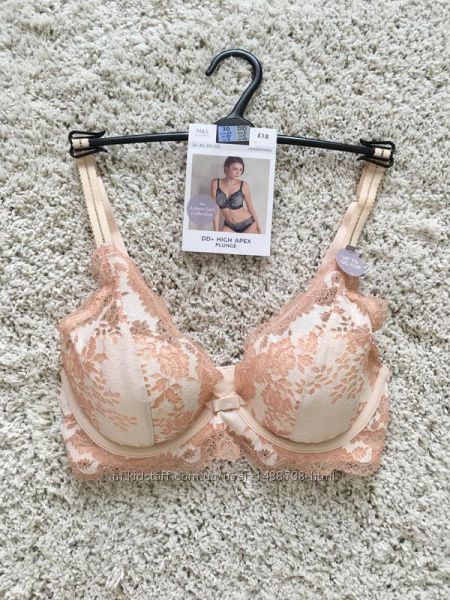 Дуже красивий мереживний бюстгальтер - планж марки "Marks&Spencer". Колір нюдово-персиковий. Брительки не відчипаються, дуже добре підтримують бюст. Чашка висока, на тоненькому поролоні, верх чашки - лише мереживо. Застібається на 3 гачки та на 3 положення.Є різні розміри: