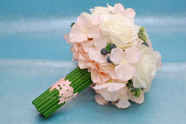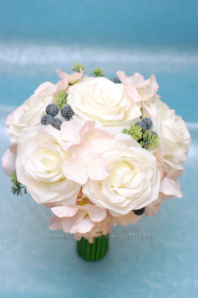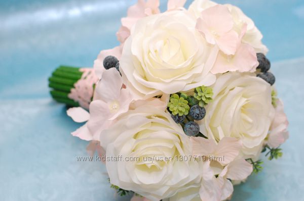 Стильный букет невесты выполнен в нежных белых и пастельных тонах. В букете использованы тканевые искусственные цветы розы и гортензии, декоративные ягодки и декоративная зелень. Букет может выступать не только в качестве букета-дублера, но в качестве основного, поскольку выглядит он довольно натурально. Ручка букета также максимально приближена к натуральному виду, декорирована лентой. Такой букет никогда не завянет и будет радовать своим видом многие годы. Высота букета 27 см, диаметр цветочной полусферы 22 см.Другие объявления продавца