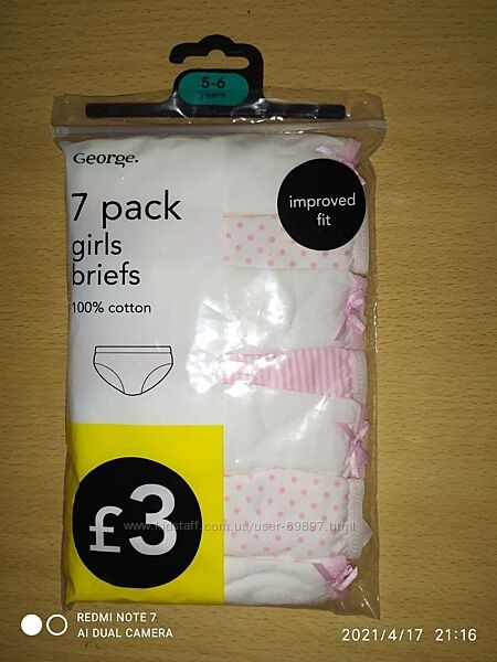 Продам новые трусики-недельки известной английской фирмы Джордж и Теско для девочки, размер 3-4 года (98-104), 5-6 лет (110-116), 6-7 лет (116-122), Состав ткани 100% коттон100% предоплата на карточку Приватбанка , отправка за счет покупателя Новая почта и Укрпочта.