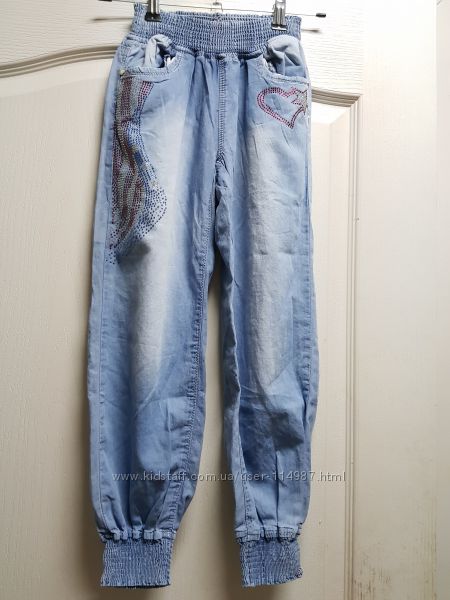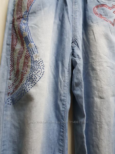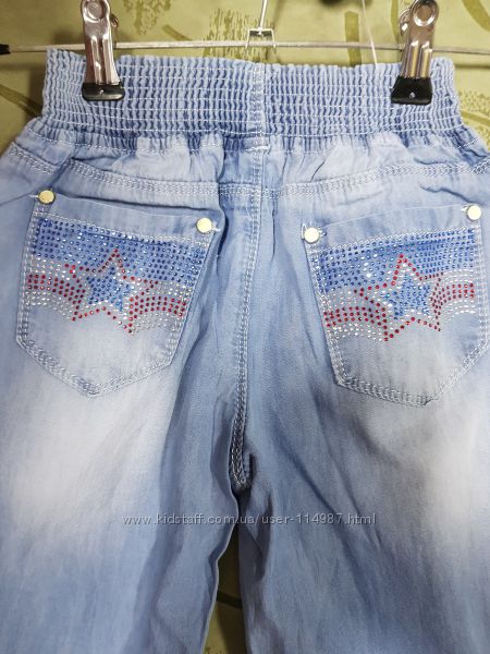Распродажа летних джинсиков для девочек.Ф.1-3-бананы.Очень тонкий джинс. Пояс и манжет на резинке.Украшены стразами.