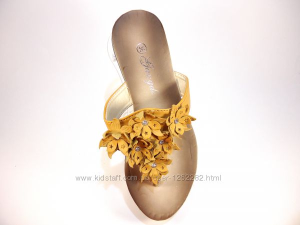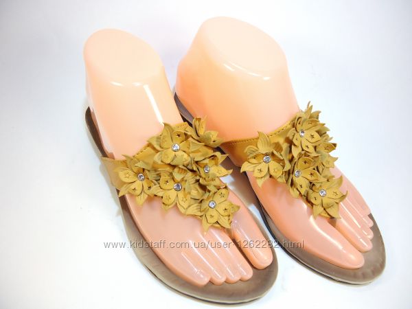 Модель № 277. Пожалуйста, при заказе по телефону (068 954 1410. Наташа) - указывайте номер модели. Женские легкие сланцы из новой коллекции модной обуви на лето. Модель на удобной, гибкой полиуретановой подошве, изготовлена из качественной искусственной кожи бежевого цвета. Мягкая стелька из искусственной кожи. Одеваются на ногу через палец с удобным силиконовым разделителем для пальчиков, который дополнительно фиксирует стопу. Верх украшен объемными лепестками в виде ромашек. Такие шлепанцы - сланцы подойдут к любой светлой одежде, станут верными спутниками в жаркий день!Удачная открытая модель обуви для жаркого лета, для поездок на море, в отпуск, а так же для прогулок по городу!