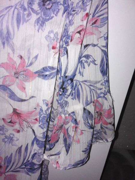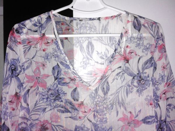 Шифоновая легкая блуза в прекрасных цветах. Вещь очень утонченная и воздушная. На блузе принт с нереально красивыми и нежными орхидеями. А золотые полосы придают ей нарядности и изысканности. Длина - 57 см.ПОГ- 53 см.