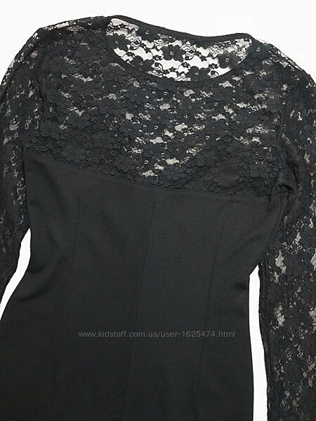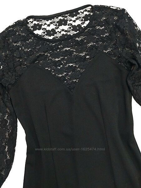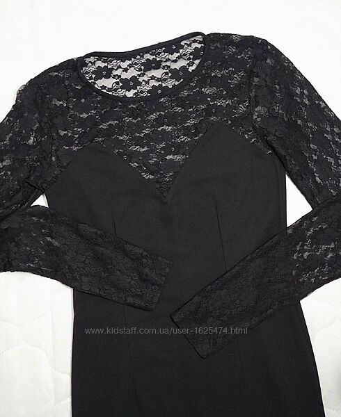 Класична чорна сукня футляр з візуальним елементом декольтованого ліфа, ажурні рукава, перед та спина, р. S (42-44). Бірку з розміром обрізала, була занадто довгою.Стан ідеальний, як нова.