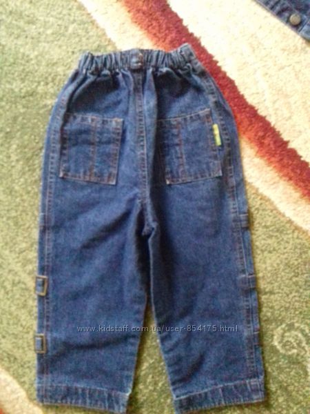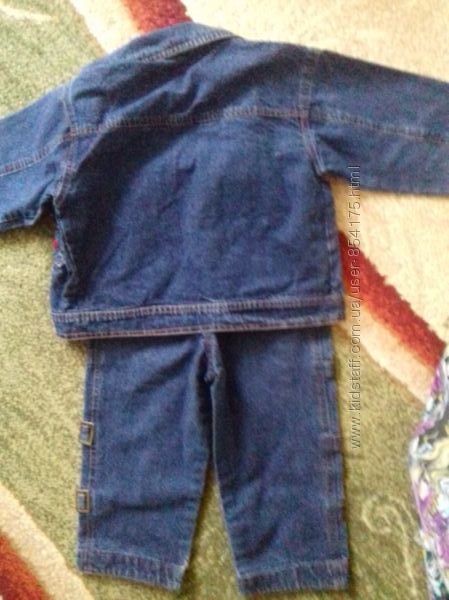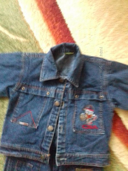 Джинсовий костюм з куртки та штанів для хлопчика у відмінному стані. З дефектів - тільки невеликі жовті цятки на попі штанів (видно на фото).Продається в комплекті. При купівлі куртки її ціна 100 грн. На курточці спереду кишені, на штанах скрізь обманки. Самі штани на поясі із гумкою.Вимірювання.