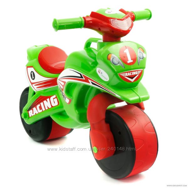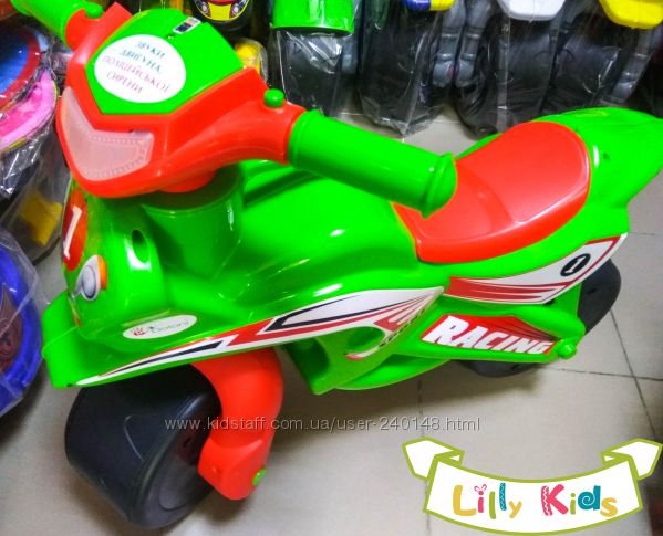Мотоцикл изготовлен из качественного, нетоксичного пластика в ярких цветах.