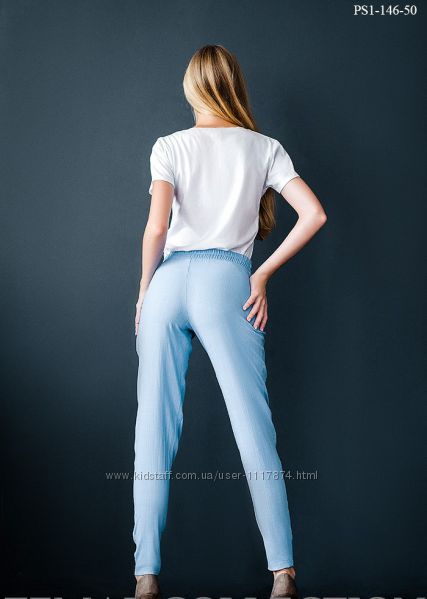 Брюки свободного силуэта. Пояс фигурный, разрезной из 3-х частей, по задней половинке на резинке. В боковые швы пояса втачан шнурок. На передних половинках обработаны карманы с бочком, по верхнему срезу – заложены односторонние складочки.