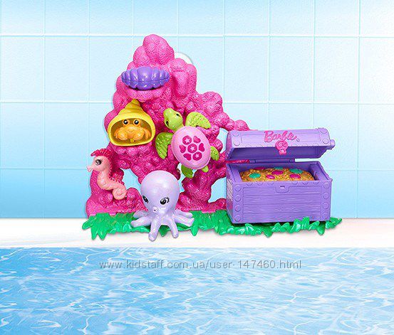 Barbie® надела яркий плавательный костюм и готова исследовать сверкающий розовый риф со множеством сюрпризов! Активируй специальный механизм на рифе, чтобы увидеть, как краб появляется из своего убежища и вновь прячется, фиолетовая устрица открывает и закрывает свои створки, показывая жемчужину.