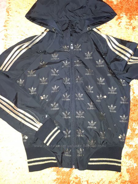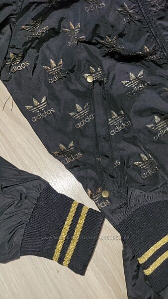 Спортивный костюм Adidas. Ткань-плащевка. Манжеты и пояс на резинке.Золотистый принт ,лампасы,вышивка. В отличном состоянии,как новый. Размер 38