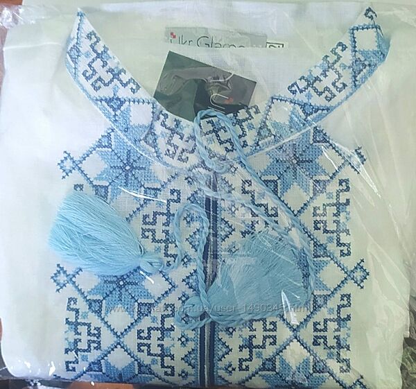 Вишита сорочка голубими нитками на білому льоні має багатий та святковий вигляд.Так чудово можуть виглядати ваші діти на будь-якому святі чи фотосесії.Також Вас приємно здивує, одна деталь, якою доповнені вироби - вишитий патик, завдяки якому рукав перетворюється в короткий.Машинна вишивка хрестиком, довгий рукав.