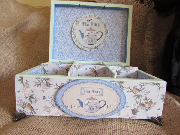 Чайный набор состоит из шкатулки на шесть отделений для чайных пакетиков и подставок для чашек в количестве 4 штук,которые находятся в подставочке.В чайной шкатулке можно хранить не только чай,но и конфеты,печенье,сахар в стикерах.Набор декорирован в технике декупаж,украшен шильдами,натуральным кружевом с вышитыми цветочками,кисточкой,металлическими ножками и ручкой.