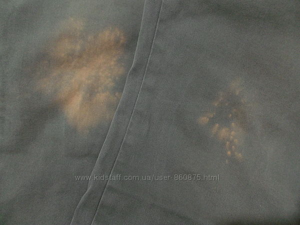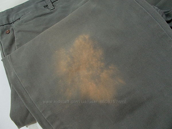 Брюки в хорошем состоянии. Материал помытого цвета хаки с эффектом заношенности (garment dyed) и разной формы оранжевыми пятнами в зоне колен, средней плотности (470 грамм), эластичный. Средняя посадка, сужающиеся штанины (носились в подвернутом состоянии), легкие потертости на краях карманов. Застежка - молния YKK и пришитые вручную 2 оранжевые роговые пуговицы (одна внутренняя) с вырезанной фирменной эмблемой - швейной машинкой, 5 карманов, фирменная нашивка над задним карманом над передним - фирменная заклепка.