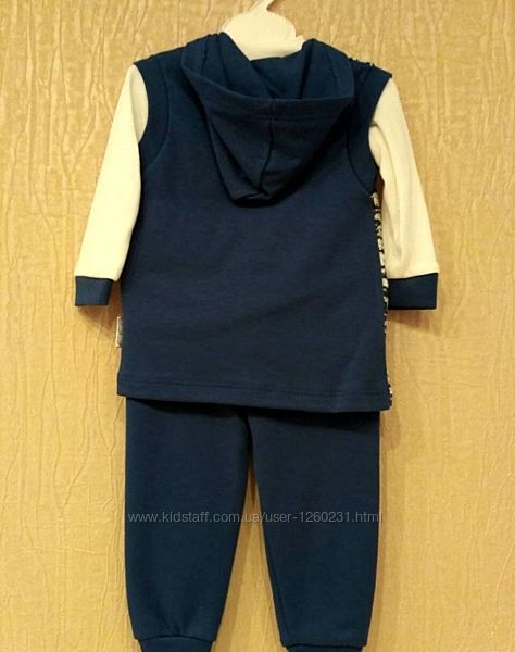 Костюм для мальчика 9-12 мес. Состав: 100% хлопок.В комплект входит: реглан, жилетка с капюшоном, штаны.Производство: Турция.