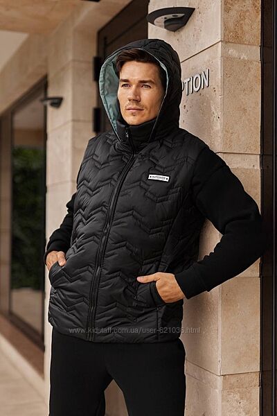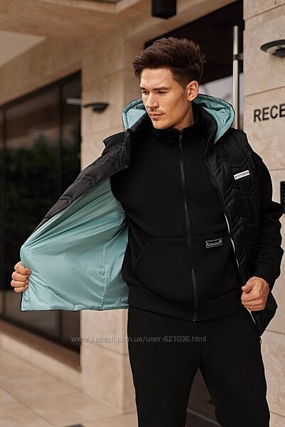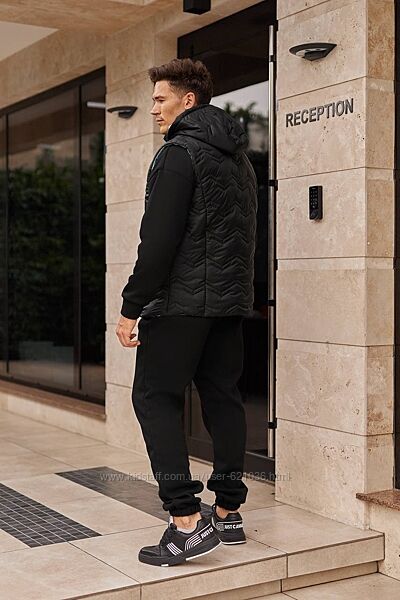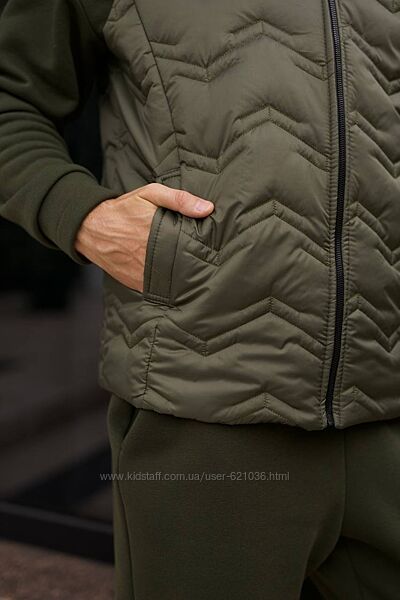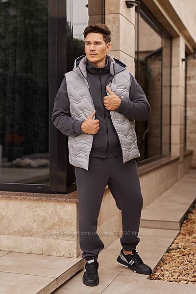 Костюм з жилетом , чоловічий ,теплий, на флісі. Кофта спереду має застібку блискавку,кишені кенгуру прикрашені нашивкою. Рукава на манжетах. Штани - висока посадка з кишенями, і знизу на гумці. Жилет з капюшоном, з врізаними кишенями, на підкладці з плащової тканини, застібається на блискавку, на грудях прикрашений нашивкою.
