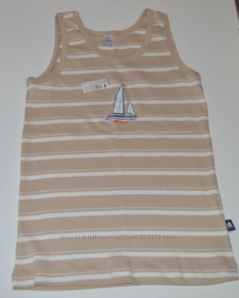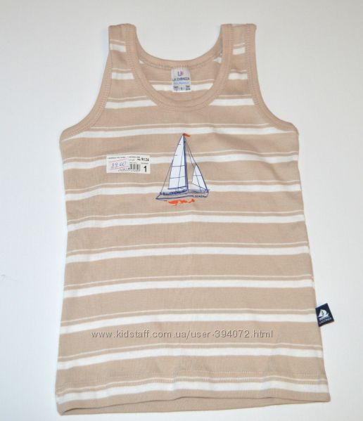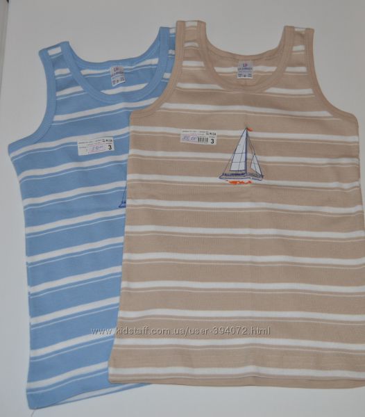 Майка в трех цветах: голубая (как на фото), серая, песочная. Все идут в полоску, с парусником. В комплект можно подобрать трусы-боксеры таких же оттенков с парусником.