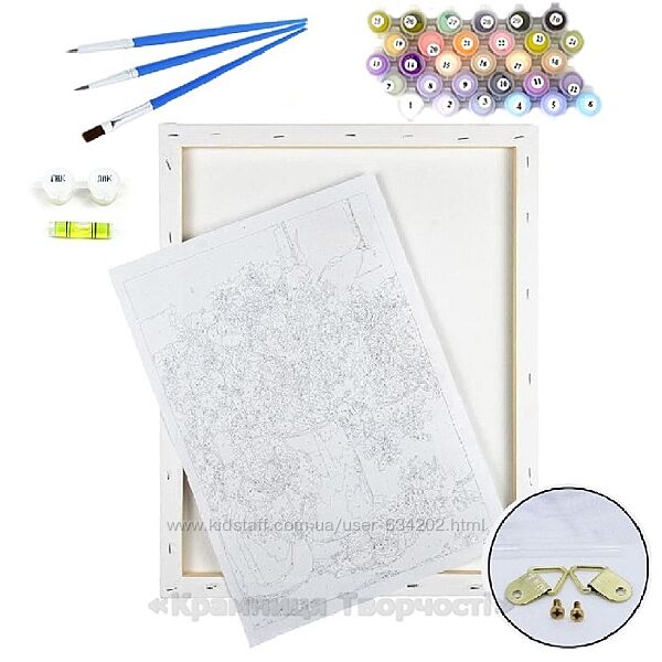 У набір «Картина за номерами Strateg Преміум з лаком та рівнем» входить: