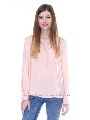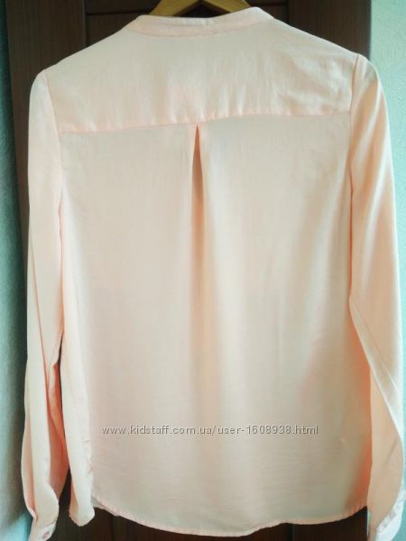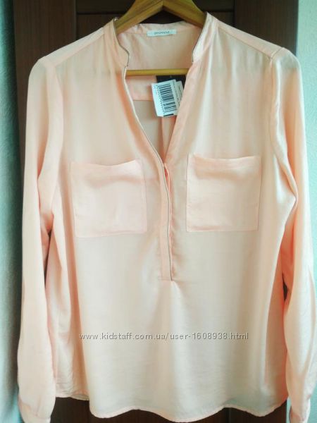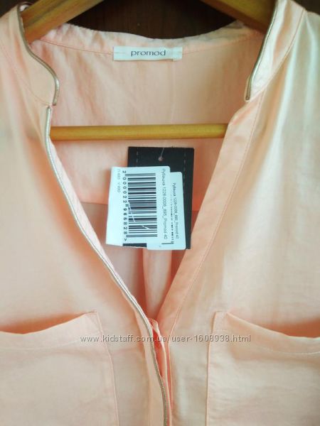 Блуза свободного кроя с накладными карманами. Воротник и рукава обработаны золотистым кантом. Застежка скрытая. Размер 42, на L-XL. Замеры: ПОГ 53 см, высота 68 см, длина рукава от плеча 63 см, ПО рукава в районе проймы 16.5 см.