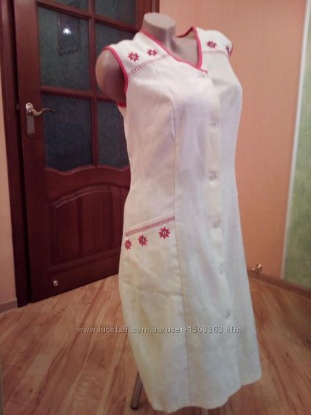 Платье-халат светло желтого цвета с ручной вышивкой. Карманы функциональные. Длина по спинке 98, ПОг 48. По бедрам приблизительно 53. По бокам ушивался, можно расшить. Состав: Лен,котон Возврата нет.