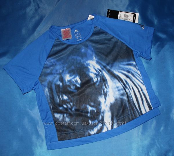 Детская укороченная футболка (топ) от Adidas . Круглый вырез горловины. Короткий рукав. Украшена стильным принтом тигра на груди. Идеальный вариант для тренировок и повседневной носки. Система Climalite.