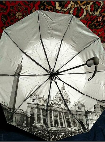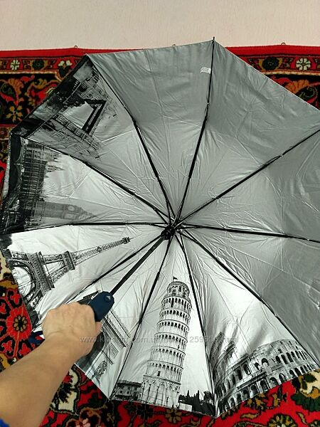 Зонт обладает оригинальным дизайном, принт нанесен на внутренней стороне купола, по серебристому напылению. Это очень качественные
