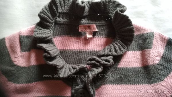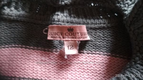 Короткая кофточка-разлетайка с рукавчиком до локтя турецкого производства фирмы Duicy Couture на девочку ростом 140-146см.100% хлопок, средней плотности, очень-очень мягкая и приятная на ощупь.Застёгивается впереди на одну пуговицу, прямого кроя, сзади сбоку пришито украшение- сердечко, горловина отделана рюшами.