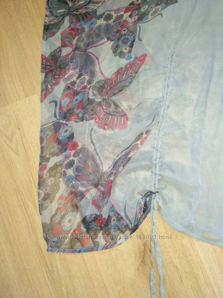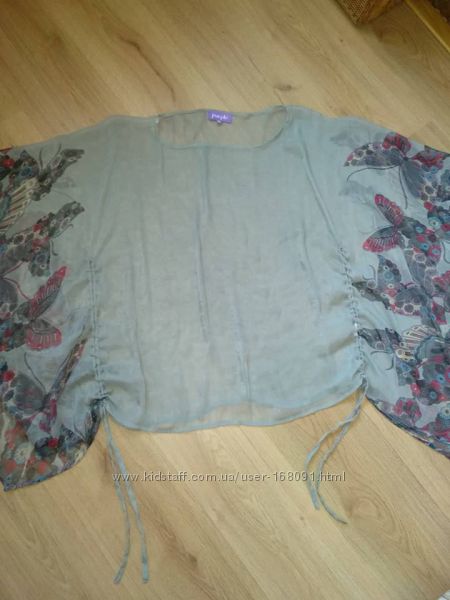 Туника /пончо пляжная Purple,с красивым принтом по бокам -бабочки,по боковым швам кулиски,за счет них можно регулировать длину,состояние идеальное,без дефектов,размер 46-50,замеры : ширина 140 см,длина 68 см, ширина между боковыми швами 62 см.